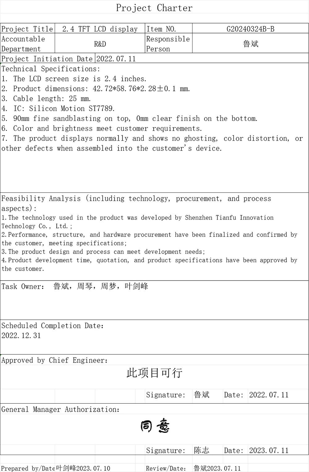 TFT LCD স্ক্রীন মডিউল স্পেসিফিকেশন
